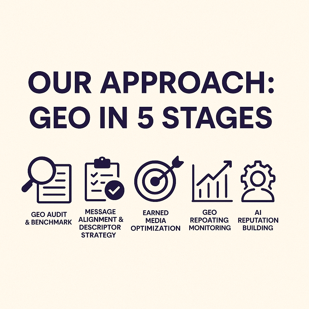 Generative Engine Optimization (GEO) is the natural evolution of PR in the age of Large Language Models (LLMs), and we approach it as a new strategic layer of communication that bridges earned media, data intelligence, and narrative consistency.